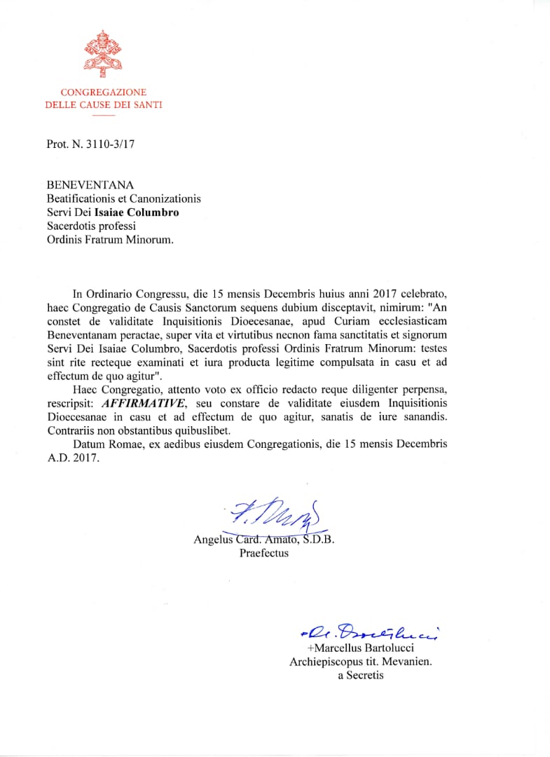 Con gioia annunciamo che la Congregazione delle Cause dei Santi, con decreto del 15 dicembre u.s., ha riconosciuto la validità giuridica dell’Inchiesta diocesana “sulla vita, le virtù, la fama di santità e dei segni” del nostro Servo di Dio Padre Isaia Columbro. Ora la Postulazione generale dell’Ordine dei Frati Minori provvederà ai passi successivi in vista della composizione del volume della “Positio Super vita et virtutibus”. Ringraziamo il Signore, e coloro che hanno lavorato nella fase diocesana dell’inchiesta, aperta domenica 13 luglio 2014 e chiusa sabato 21 maggio 2016.