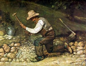 Un giorno, però, vide una figura che si stagliava all’orizzonte. Era un uomo un po’ curvo con un grosso martello. Un tagliapietre. Incominciò a battere con il martello su di lui. Più che male sentì sgomento. Il tagliapietre era ancora più forte e poteva decidere del suo destino. «Come vorrei essere il tagliapietre» pensò.