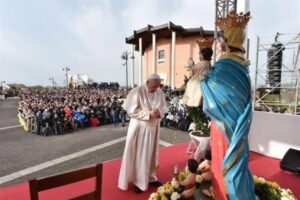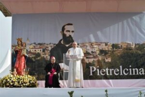 Cari fratelli e sorelle di Pietrelcina e della diocesi di Benevento, voi annoverate san Pio tra le figure più belle e luminose del vostro popolo. Questo umile frate cappuccino ha stupito il mondo con la sua vita tutta dedita alla preghiera e all’ascolto paziente dei fratelli, sulle cui sofferenze riversava come balsamo la carità di Cristo. Imitando il suo eroico esempio e le sue virtù, possiate diventare voi pure strumenti dell’amore di Dio, dell’amore di Gesù verso i più deboli. Al tempo stesso, considerando la sua incondizionata fedeltà alla Chiesa, darete testimonianza di comunione, perché solo la comunione – cioè l’essere sempre uniti, in pace fra noi, la comunione fra noi – edifica e costruisce. Un paese che litiga tutti i giorni non cresce, non si costruisce; spaventa la gente. È un paese malato e triste. Invece un paese dove si cerca la pace, dove tutti si vogliono bene – più o meno, ma si vogliono bene –, non ci si augura del male, questo paese, benché piccolo, cresce, cresce, cresce, si allarga e diventa forte. Per favore non spendete tempo, forze, a litigare fra voi. Questo non fa nulla. Non ti fa crescere! Non ti fa camminare. Pensiamo a un bambino che piange, piange, piange e non vuole muoversi dalla sua culla e piange, piange. E quando la mamma lo mette sul pavimento perché incominci a gattonare, piange, piange… e torna nella culla. Vi domando: quel bambino sarà capace di camminare? No. perché è sempre nella culla! Se un paesino litiga, litiga, litiga, sarà capace di crescere? No. Perché tutto il tempo, tutte le forze vanno a litigare. Per favore: pace fra voi, comunione fra voi. E se a qualcuno di voi viene voglia di chiacchierare di un altro, mordetevi la lingua. Vi farà bene, bene all’anima, perché la lingua si gonfierà, ma vi farà bene; anche al paese. Date questa testimonianza di comunione. Auspico che questo territorio possa trarre nuova linfa dagli insegnamenti di vita di padre Pio in un momento non facile come quello presente, mentre la popolazione decresce progressivamente e invecchia perché molti giovani sono costretti a recarsi altrove per cercare lavoro. La migrazione interna dei giovani, un problema. Pregate la Madonna perché vi dia la grazia che i giovani trovino lavoro qui, fra voi, vicino alla famiglia, e non siano costretti ad andarsene a cercare da un’altra parte e il paese giù, giù, giù. La popolazione invecchia, ma è un tesoro, i vecchi sono un tesoro! Per favore, non emarginate i vecchi. Non bisogna emarginare i vecchi, no. I vecchi sono la saggezza. E che i vecchi imparino a parlare con i giovani e i giovani imparino a parlare con i vecchi. Loro hanno la saggezza di un paese, i vecchi. Quando sono arrivato mi è piaciuto tanto salutare uno di 99 anni e una “ragazzina” di 97. Bellissimo! Questi sono la vostra saggezza! Parlate con loro. Che siano protagonisti della crescita di questo paese. L’intercessione del vostro Santo concittadino sostenga i propositi di unire le forze, così da offrire soprattutto alle giovani generazioni prospettive concrete per un futuro di speranza. Non manchi un’attenzione sollecita e carica di tenerezza – come ho ho detto – agli anziani, che sono patrimonio delle nostre comunità. Mi piacerebbe che una volta si desse il premio Nobel agli anziani che danno memoria all’umanità.