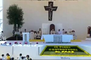 «Vivere per», ha ribadito papa Francesco, «è il contrassegno di chi mangia questo Pane». È il «”marchio di fabbrica” del cristiano». E «si potrebbe esporre come avviso fuori di ogni chiesa». «Sarebbe bello – ha poi aggiunto a braccio rispetto al testo preparato – che in questa diocesi di don Tonino Bello ci fosse questo avviso in ogni chiesa e fosse letto da tutti».