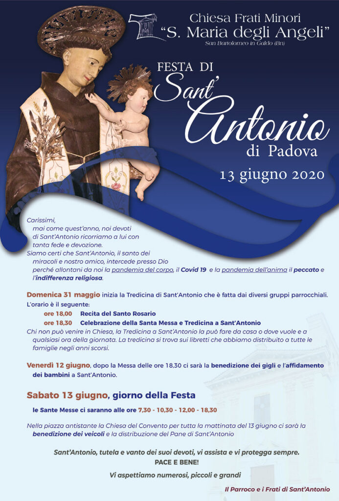 Siamo certi che Sant’Antonio, il santo dei miracoli e nostro amico, intercede presso Dio perché allontani da noi la pandemia del corpo, il Covid 19 e la pandemia dell’anima il peccato e l’indifferenza religiosa.